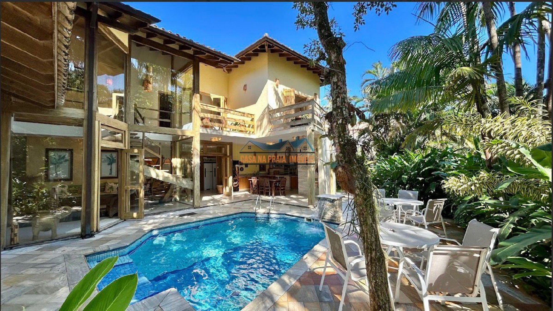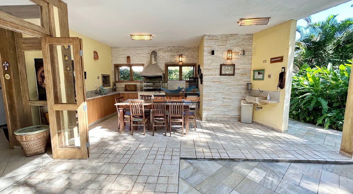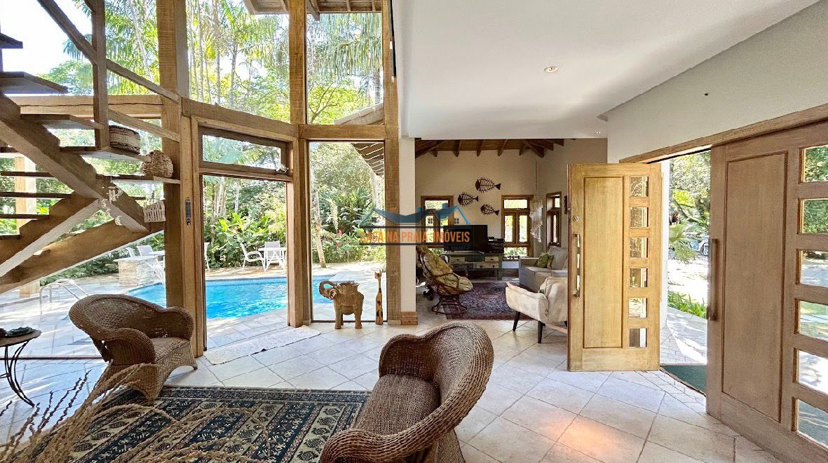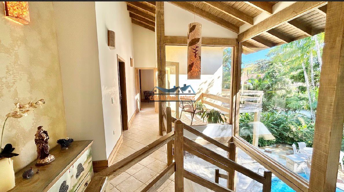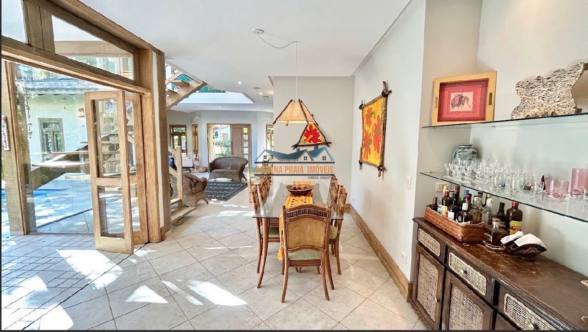 Com arquitetura praiana típica da região, o imóvel valoriza elementos como vidro, madeira e mobiliário que evocam o estilo caiçara, criando uma atmosfera leve, elegante e perfeitamente integrada ao entorno natural.